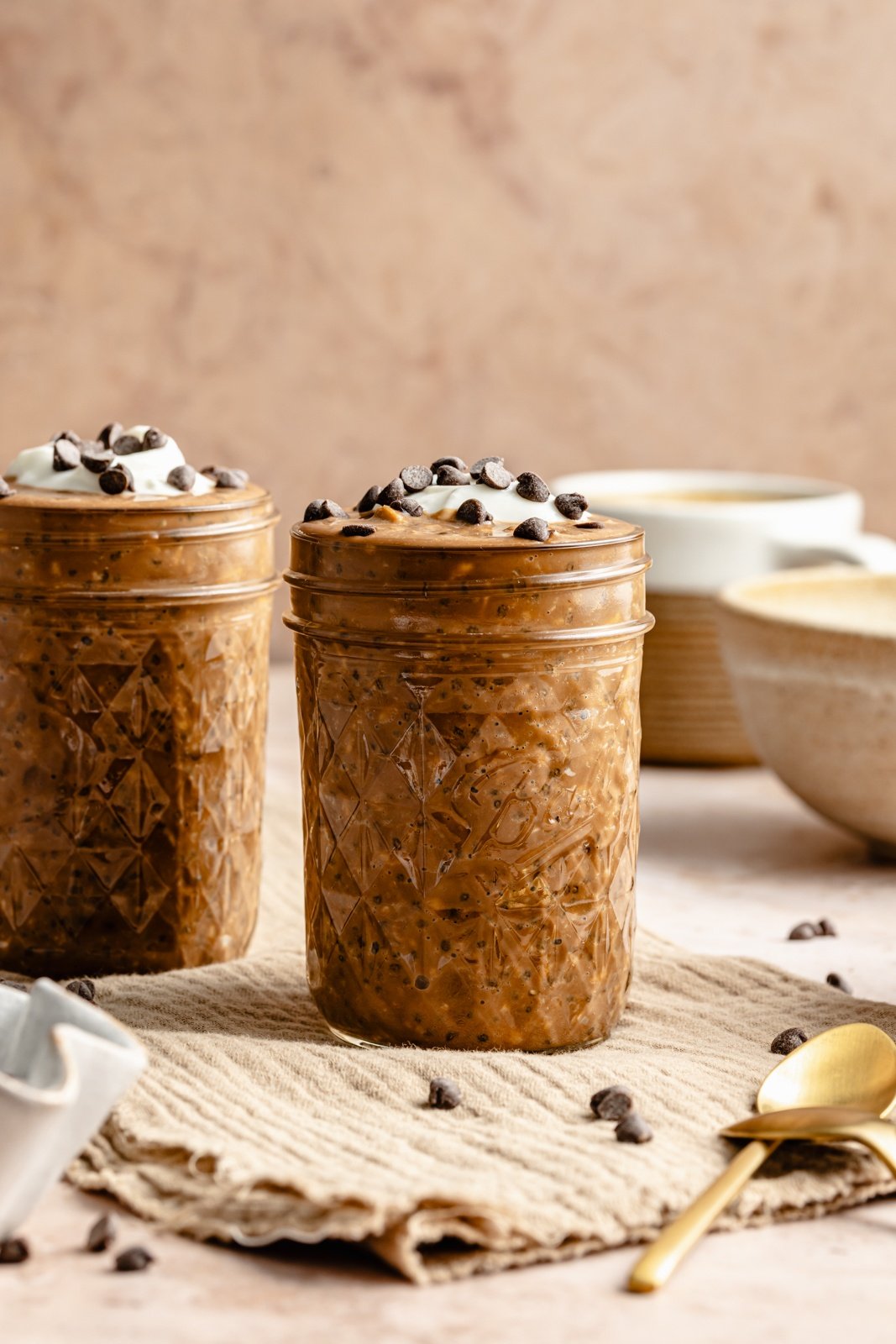 - Cover the bowl with plastic wrap and place in the fridge for 4 hours or overnight. Once ready to serve, divide between two 12 ounce mason jars (or just scoop and serve into bowls as desired.) Serve with an extra dollop of yogurt on top and sprinkle with remaining chocolate chips. These are also delicious with a drizzle or spoonful of almond butter for some healthy fats and extra protein. Serves 2.